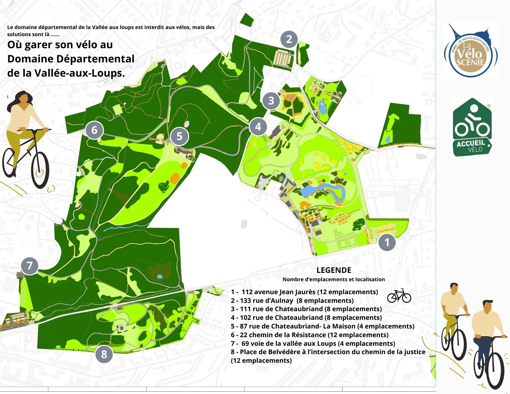 Les personnes qui viennent à bicyclette peuvent stationner leur vélo au 112 avenue Jean Jaurès (12 emplacements), au 133 rue d’Aulnay (8 emplacements), au 111 rue de Chateaubriand (8 emplacements), au 102 rue de Chateaubriand (8 emplacements), au 87 rue de Chateaubriand – La Maison (4 emplacements), 22 chemin de La Résistance (12 emplacements), 69 voie de la Vallée aux Loups (4 emplacements), Place de Belvédère, à l’intersection du chemin de la Justice (12 emplacements).